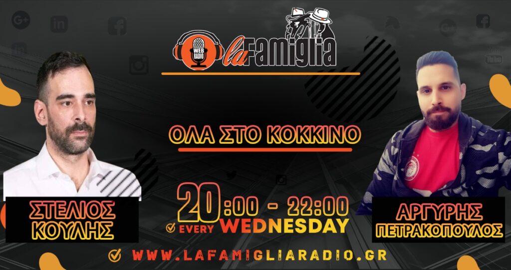 Έρχεται η αγαπημένη σας εκπομπή στη γνωστή πλέον μέρα και ώρα. ΟΛΑ ΣΤΟ ΚΟΚΚΙΝΟ λοιπόν! Σήμερα βράδυ (20:00-22:00) οι συντάκτες του Thrilemou.gr παίρνουν θέση πίσω από τα μικρόφωνα του Lafamiglia Radio για ακόμα ένα φουλ Ολυμπιακό δίωρο.