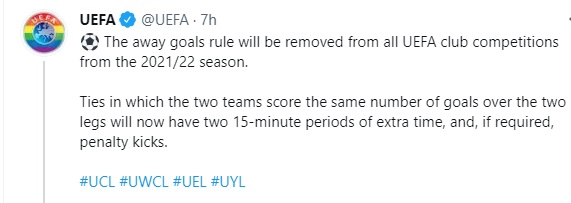 Σύμφωνα με την ανακοίνωση της UEFA, ο κανονισμός θα πάψει να υφίσταται άμεσα και συγκεκριμένα από τα προκριματικά των Κυπέλλων Ευρώπης της σεζόν 2021-2022.